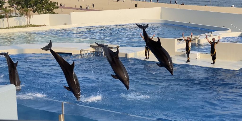 ジャンプしたり、くるくる回ったり、お姉さんを乗せて泳いだり。