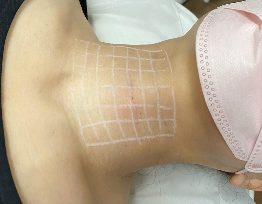 首に注入する時は、シワに沿ってシワを埋めるように注入し、それに加え肌の水分量を増やしハリを持たせるように全体的に注入します。